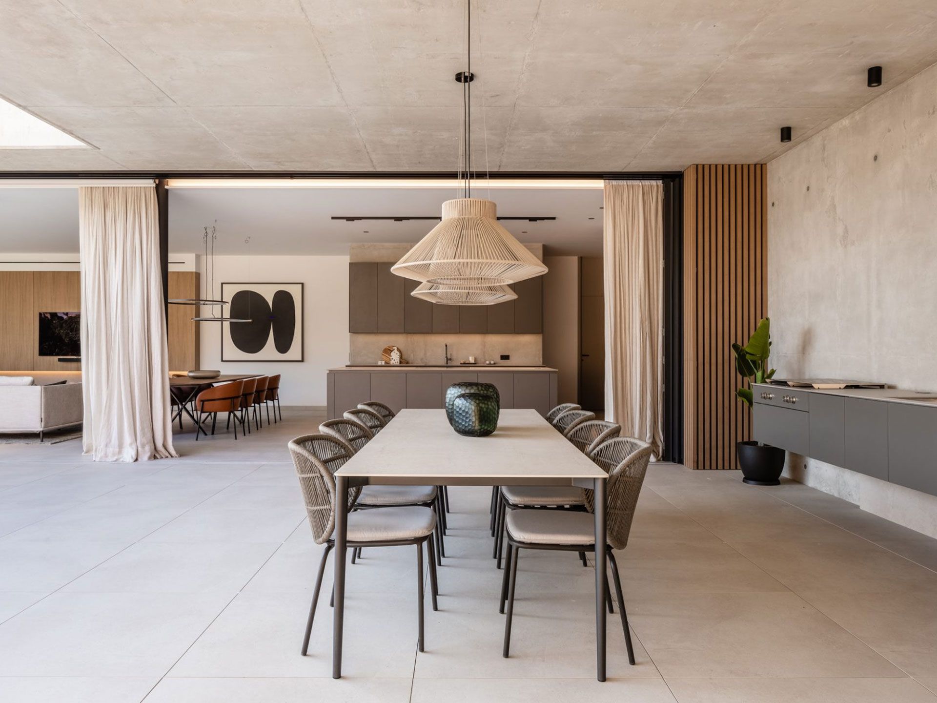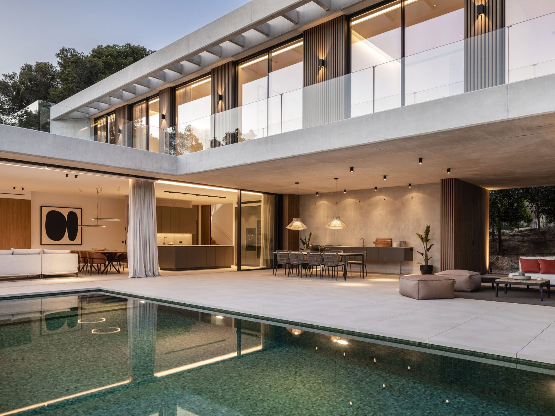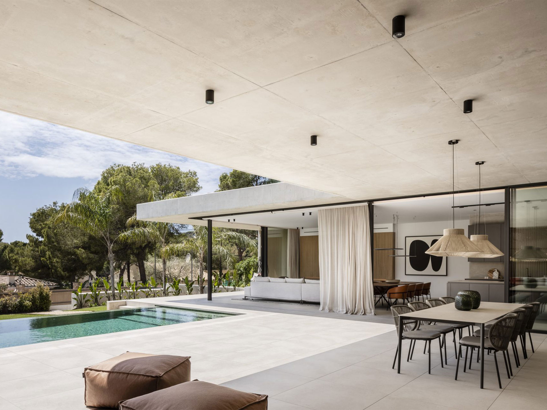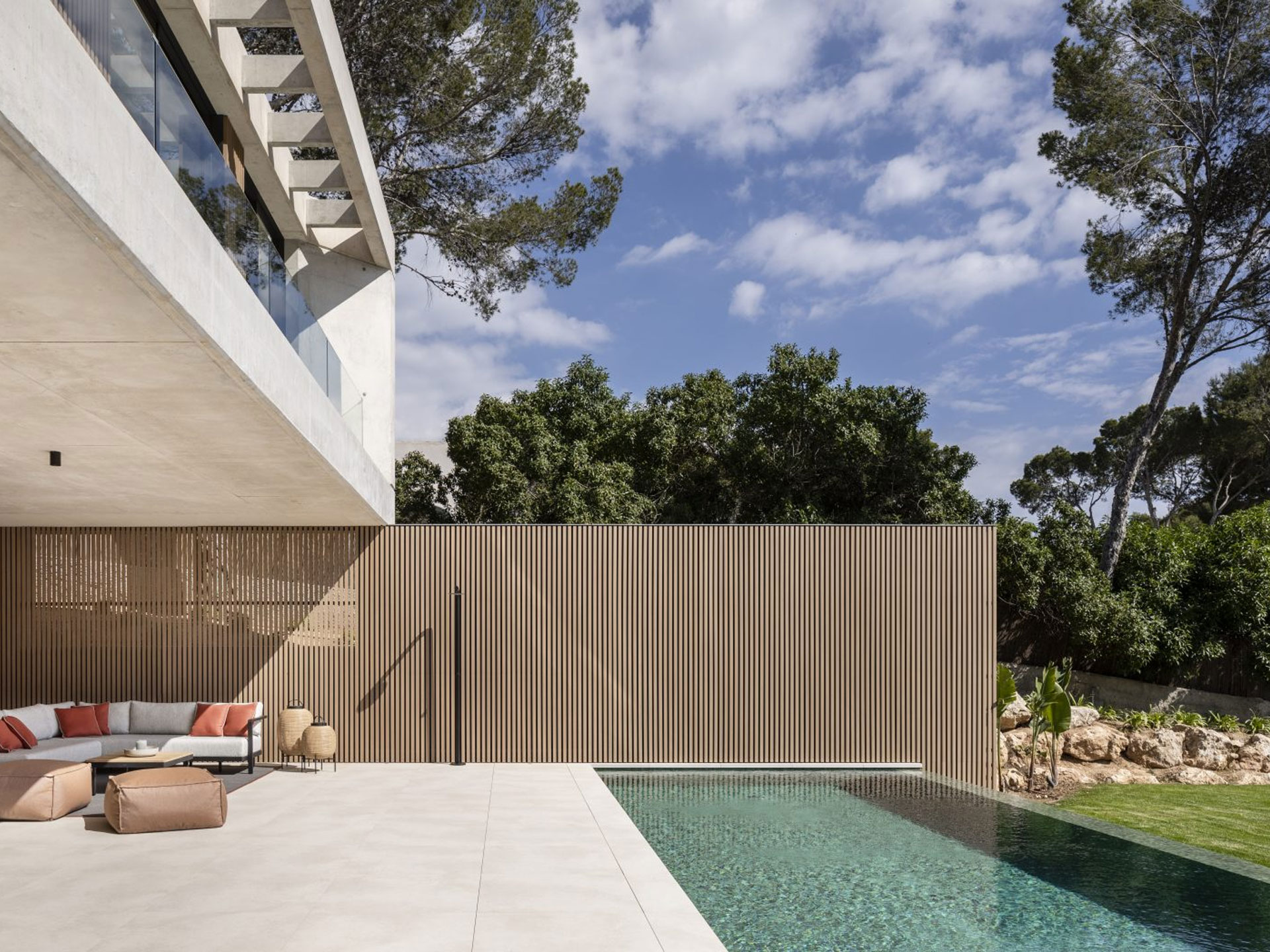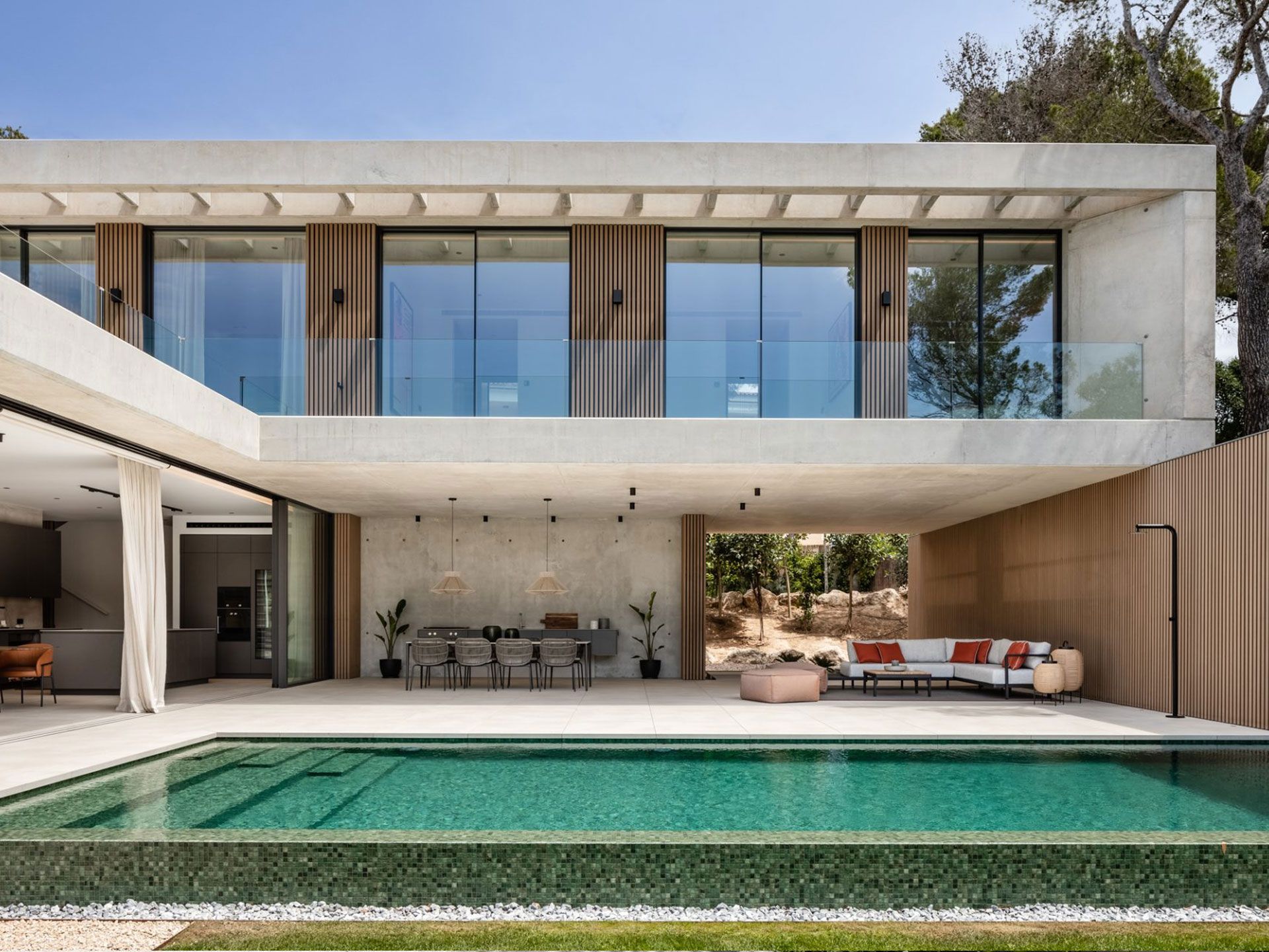The flat garden plot is excellent for staging the progressive design. A perfect sun orientation (southwest) guarantees all-day sun-bathing. The future owners will benefit from a fundamental design element. The huge covered terrace is the heart of this property. An open-plan exterior living area with a view of the pool and garden offers over 70 sqm. This area, which also boasts an outdoor kitchen, is directly connected to the kitchen and living area of the house. Thanks to retractable windows, we create a perfect inside-out living experience in which the transition between inside and outside space is fluid. Although a large part of the facade has a concrete look, the villa never looks cool or too minimalist. This is thanks to the large proportion of wood. Especially in the interior it was possible to create a "clean look" with minimalist approaches, which always includes warm notes and thus perfectly balances aesthetics with a pleasant living environment.
