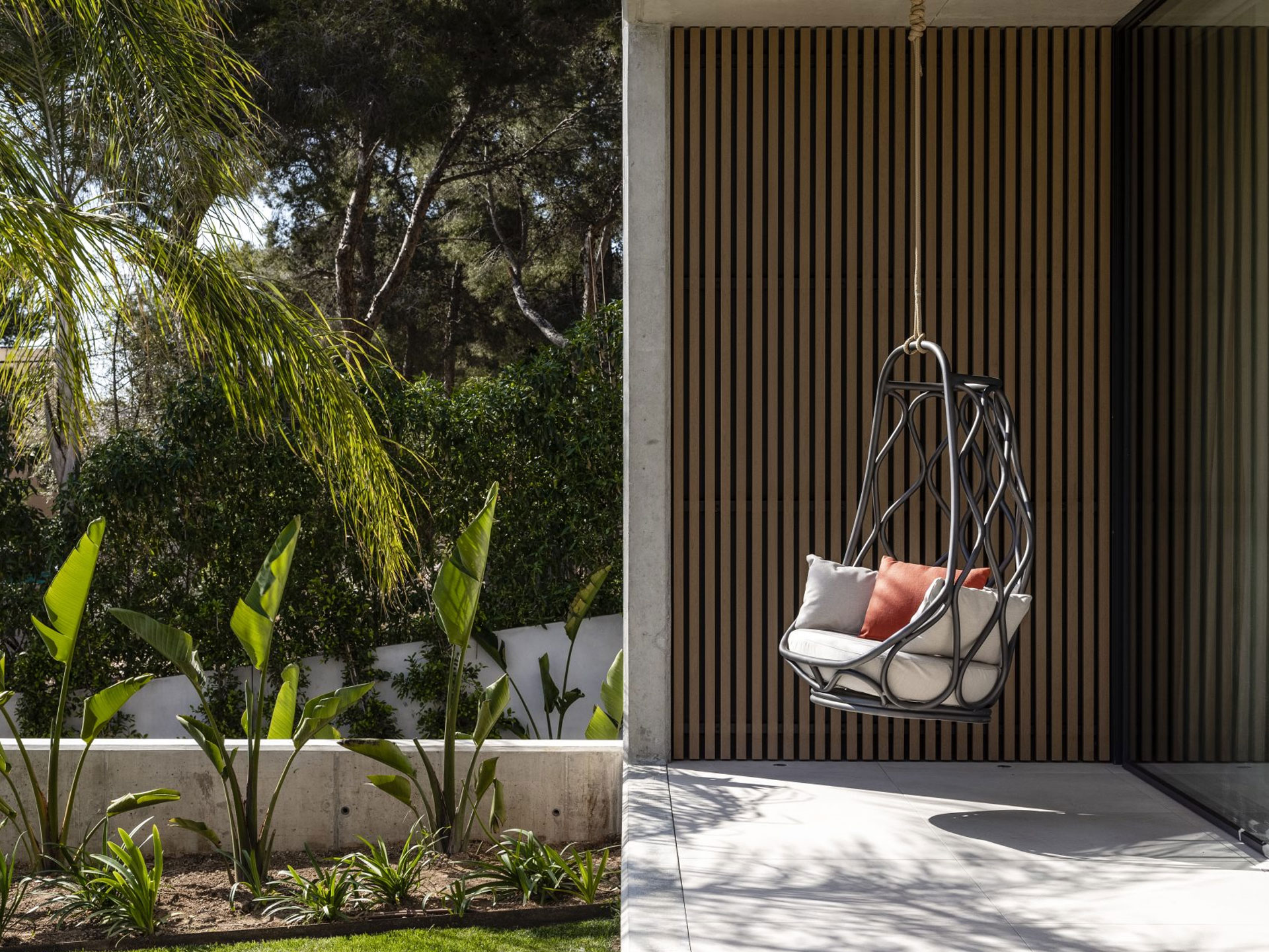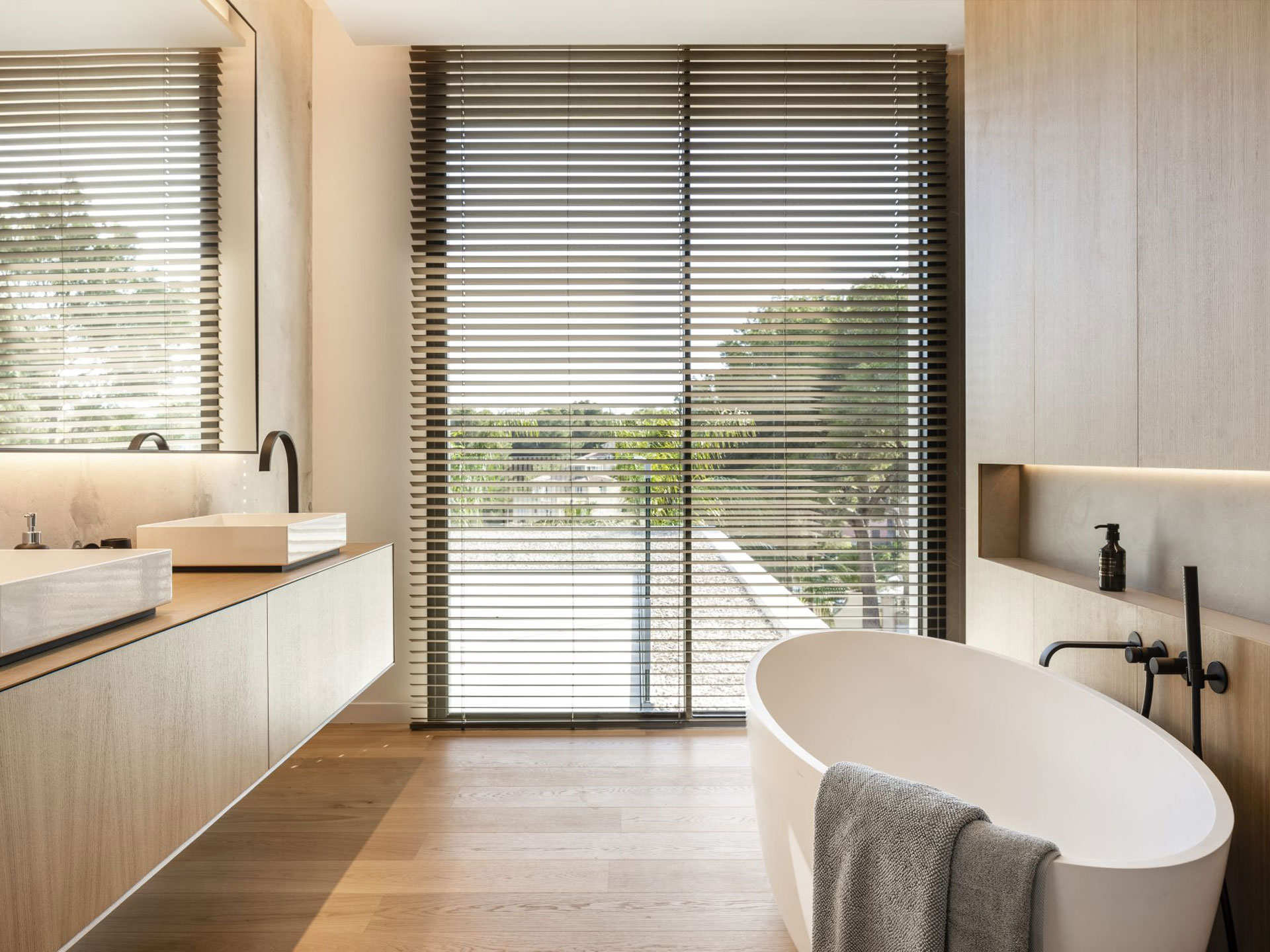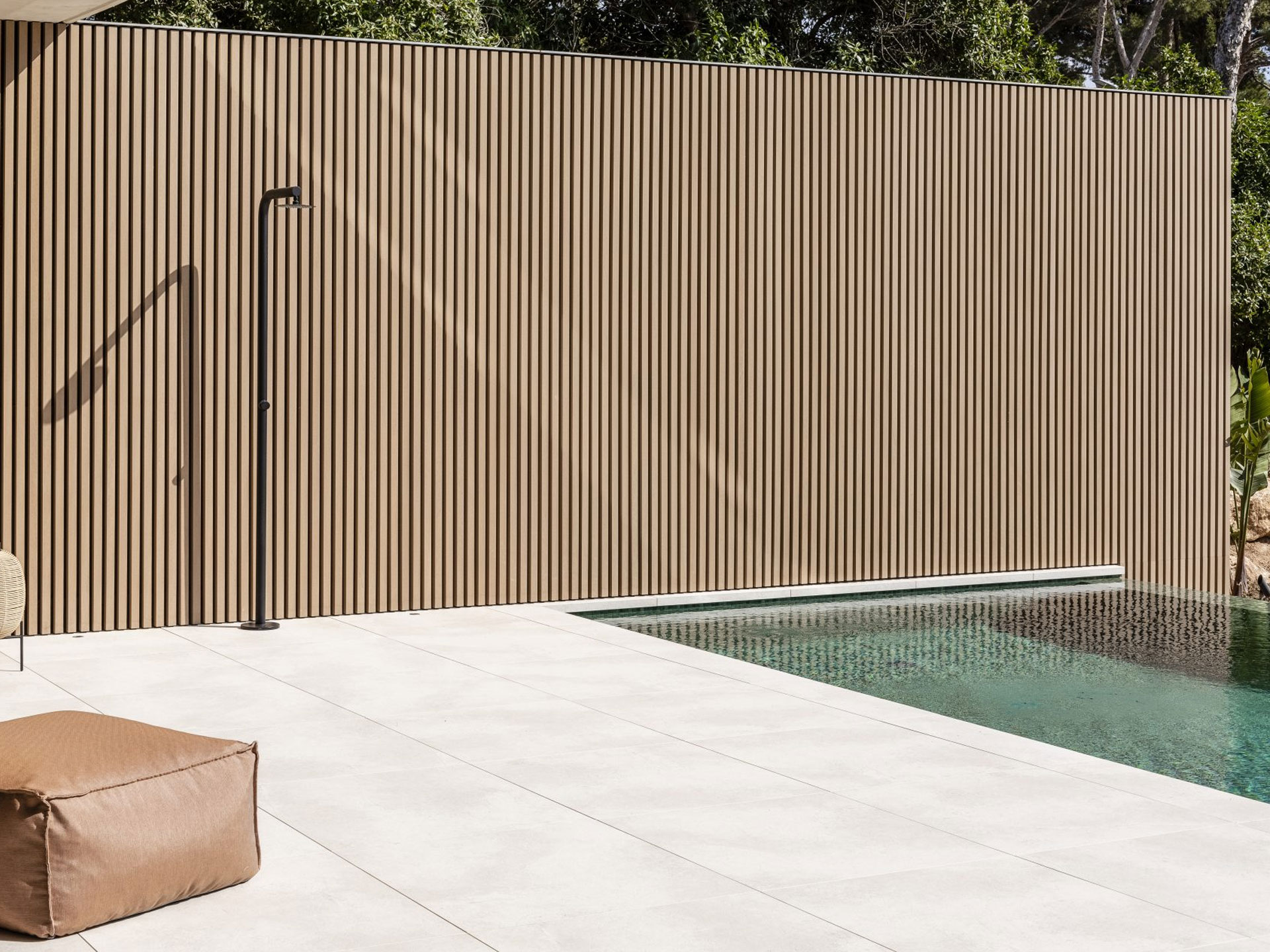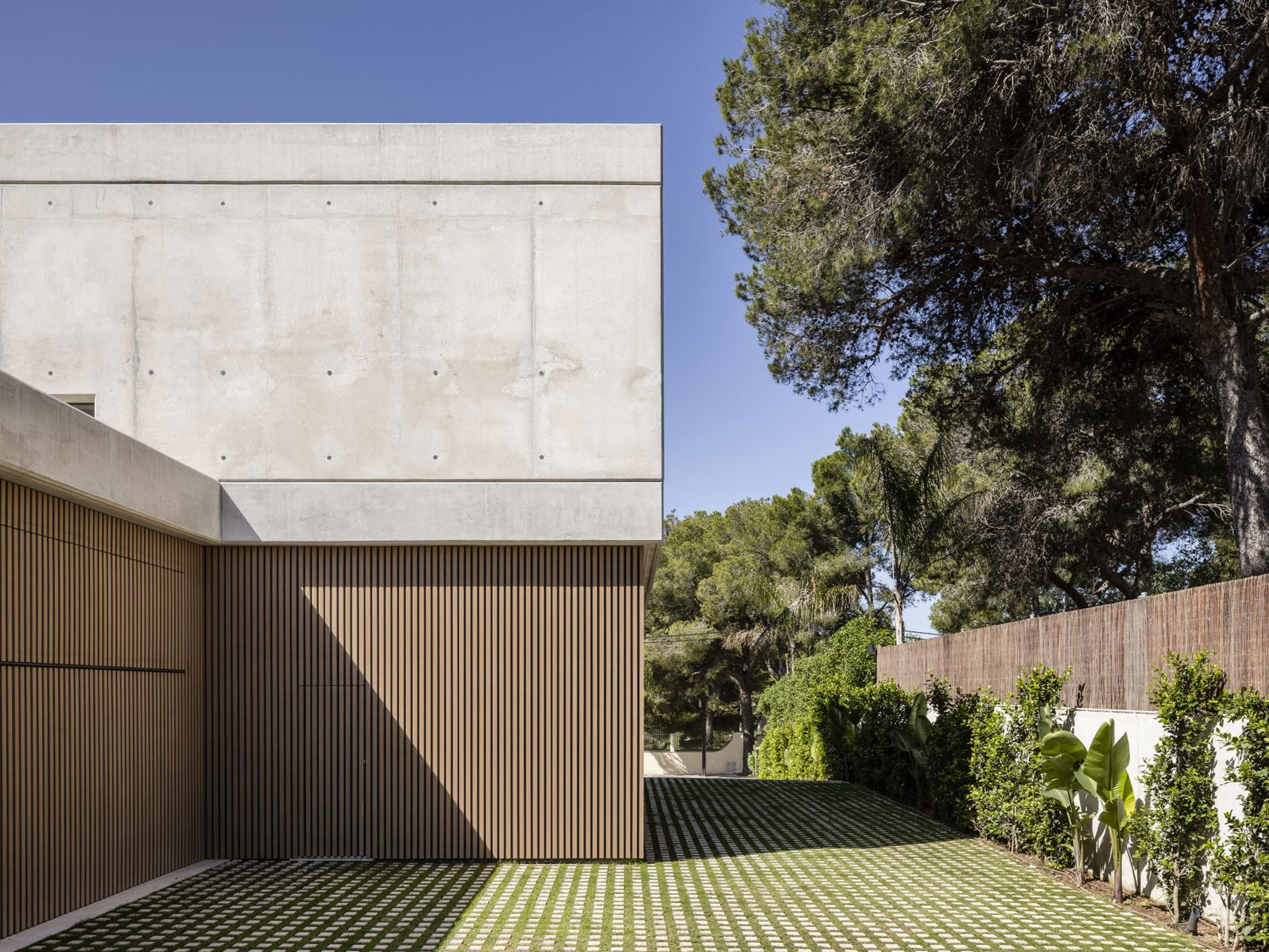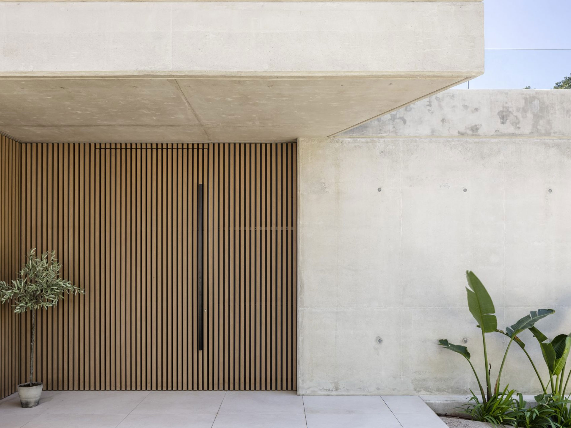 The flat garden plot is excellent for staging the progressive design. A perfect sun orientation (southwest) guarantees all-day sun-bathing. The future owners will benefit from a fundamental design element. The huge covered terrace is the heart of this property. An open-plan exterior living area with a view of the pool and garden offers over 70 sqm. This area, which also boasts an outdoor kitchen, is directly connected to the kitchen and living area of the house. Thanks to retractable windows, we create a perfect inside-out living experience in which the transition between inside and outside space is fluid. Although a large part of the facade has a concrete look, the villa never looks cool or too minimalist. This is thanks to the large proportion of wood. Especially in the interior it was possible to create a "clean look" with minimalist approaches, which always includes warm notes and thus perfectly balances aesthetics with a pleasant living environment.